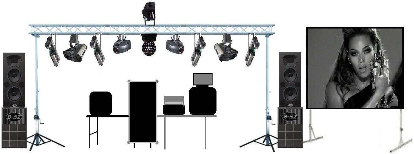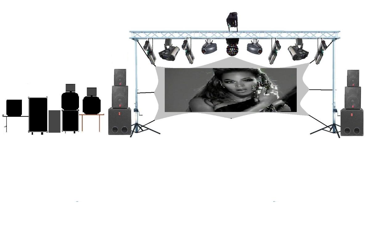 | Minimum set-up space requirements is 15' deep by 25' long. Premium DJ/Video System, Lighting System & 11' Stretch Video Screen |